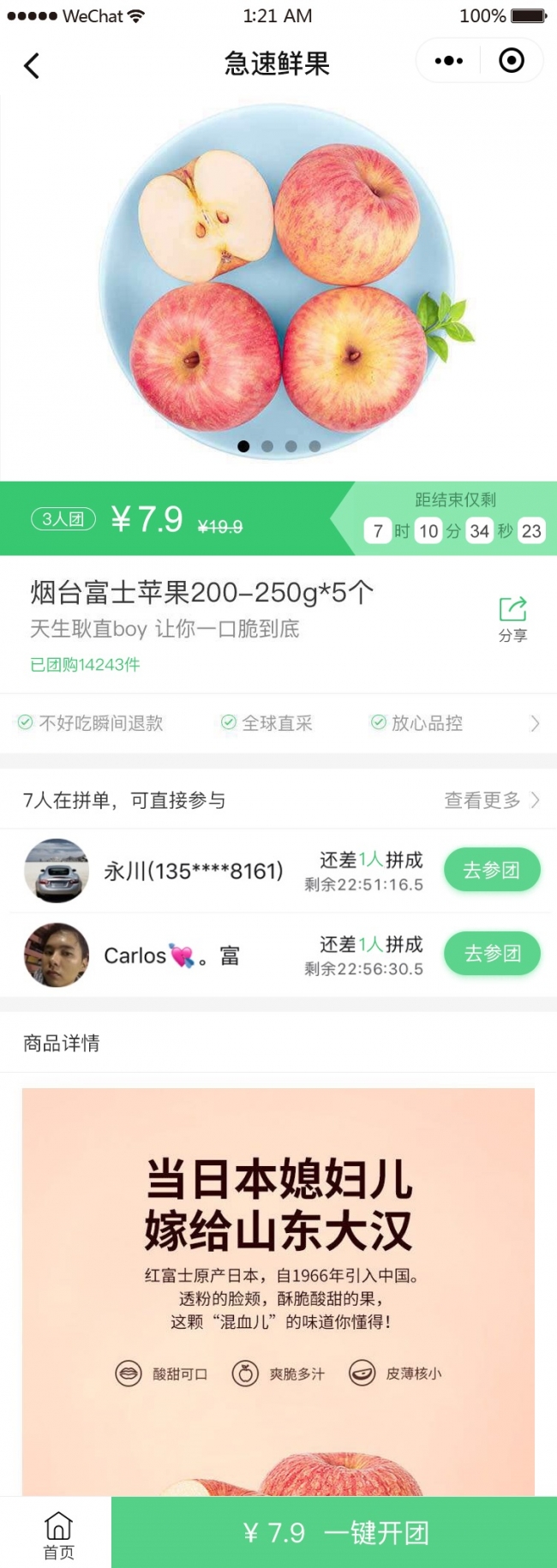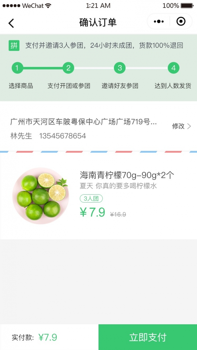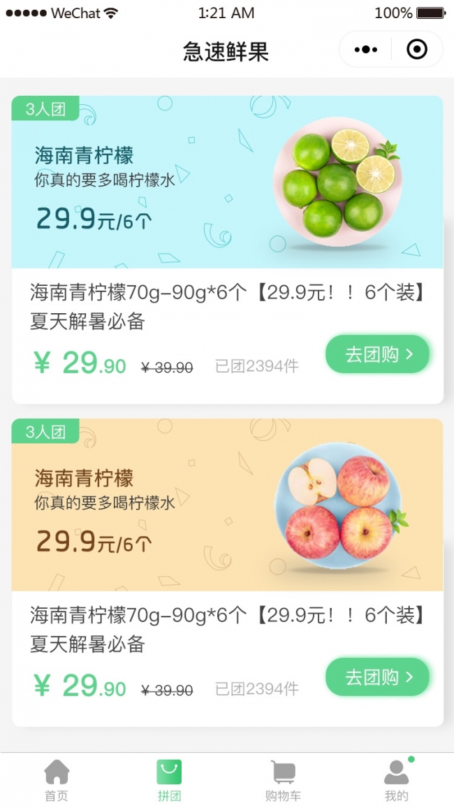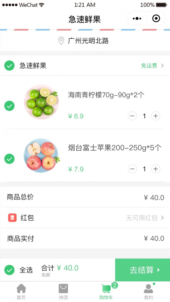 主要功能有:附近生鲜店,拼团,商品展示,下单,购买,购物车。