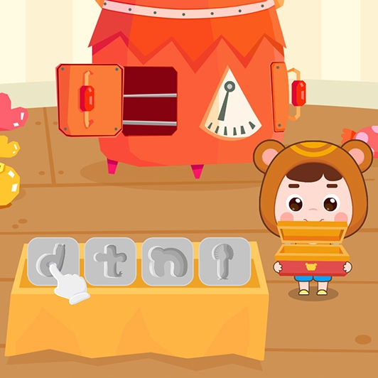 第二关是制作字母糖果。小朋友需要将底部的字母磨具拖到炉子里,制作出对应的糖果;